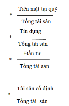 - Tiền mặt (ngân quỹ): khoản mục này bao gồm TM tại quỹ, tiền gửi tại NHNN và tiền gửi tại các tổ chức tín dụng khác. Đây là khoản mục có tính lỏng cao nhất trong toàn bộ tài sản của ngân hàng dược sử dụng nhằm mục đích đáp ứng yêu cầu quản lý của NHNN, yêu cầu rút tiền mặt, vay vốn và các yêu cầu chi trả khác hàng ngày của NHTM. Dù có tính lỏng cao nhất nhưng xét về tính sinh lời thì khoản mục này có tính sinh lời rất thấp hoặc hầu như không đem lại lợi nhuận cho NHTM nên các ngân hàng thường chỉ duy trì ở mức tối thiểu trong tổng tài sản có của mình mà thường là 2% trong tổng tài sản có.