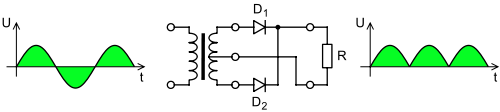 ==Bộ chỉnh lưu tăng đôi điện áp====d Một mạch chỉnh lưu nửa sóng đon giản có thể lắp ráp theo 2 kiểu với cực tính của 2 điốt đối kháng nhau một kiểu nói cho ra điện áp dương, và một kiểu nối cho ra điện áp âm. Nếu kết hợp cả 2 kiểu này cùng với hai bộ lọc san bằng độc lập, có thể đạt được điện áp ra xấp xỉ bằng 2 lần điện áp đỉnh của mạch xoay chiều. Điều này cũng có thể có được bằng cách nối biến áp có điểm giữa cho phép mỗi mạch điện là một mạch cấp nguồn riêng.