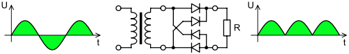 Bộ chỉnh lưu toàn sóng biến đổi cả 2 nửa chu kỳ thành một điện áp đầu ra có một chiều duy nhất: dương (hoặc âm) vì nó chuyển hướng đi của dòng điện của nửa chu kỳ âm (hoặc dương)của dạng sóng xoay chiều. Nửa còn lại sẽ kết hợp với nửa kia thành một điện áp chỉnh lưu hoàn chỉnh.