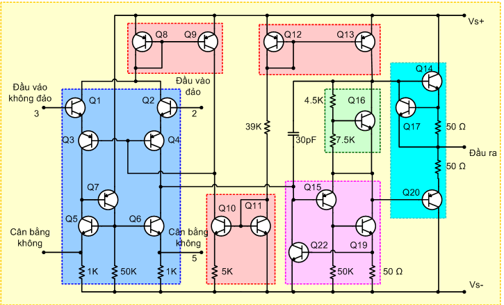 Phần mạch điện tô màu xanh dương đậm là một tầng khuếch đại vi sai. Q1 và Q2 là transistor đầu vào, lắp theo kiểu theo cực phát (hay kiểu cực thu chung) phối hôp bới đôi transistor Q3 và Q4 nối cực gốc chung thành mạch vi sai đầu vào. Ngoài ra, Q3 và Q4 cũng tác động như một bộ dời mức điện áp và tạo ra một độ lợi để kéo tầng khuếch đại lớp A Chúng cũng tăng cường khả năng chịu điện áp ngược của Vbe rating cho các transistor đầu vào.
