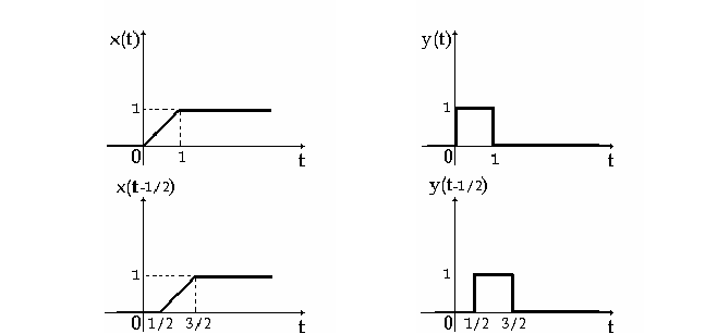 Để minh họa, cho x(t) có dạng như (H 1.13a) ta được y(t) ở (H 1.13b). Cho tín hiệu vào trễ (1/2)s, x(t-1/2) (H 1.13c), ta được tín hiệu ra cũng trễ (1/2)s, y(t-1/2) được vẽ ở (H 1.13d).
