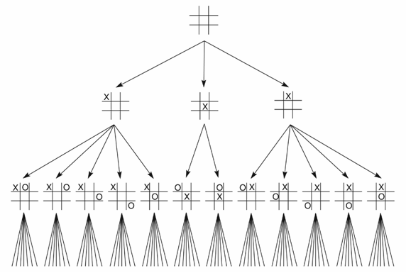 Xét trò chơi Tic-tac-toe, để tìm kiếm đến hết không gian, số lượng trạng thái sẽ là rất lớn nhưng không phải là không thể vượt qua. Mỗi nước đi trong chín nước đầu tiên đều có tám khả năng đặt quân cờ kế tiếp và đến lượt mình mỗi nước đi này lại có bảy khả năng đặt quân cờ cho nước đi tiếp tục ... Một phân tích đơn giản cho biết số lượng các trạng thái cần được xem xét cho quá trình này là 9 x 8 x 7 x ... x 1 = 9!.