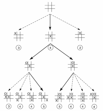 Sau đó thuật toán này sẽ chọn lựa và chuyển đến trạng thái có giá trị heuristic cao nhất (xem hình). Như trong hình vẽ, quân X sẽ chọn đặt vào vị trí trung tâm bàn cờ. Chú ý không chỉ các trạng thái tương đương khác bị loại bỏ mà tất cả con cháu của chúng cũng bị loại. Hai phần ba không gian trạng thái này đã bị loại ngay từ nước đi đầu tiên.