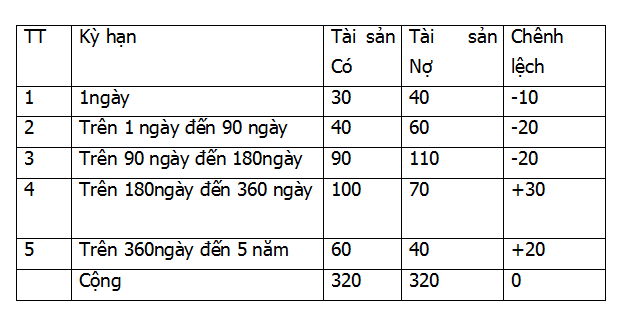 Giả sử tại một ngân hàng của Mỹ có cơ cấu tài sản Có và tài sản Nợ được phân thành 5 nhóm theo kỳ hạn như sau: