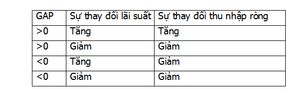 Theo mô hình trêncó thể thấy rằng, khi tài sản Có và tài sản Nợ nhạy cảm với lãi suất của ngân hàng coswj chênh lệch , ngan hàng luôn đứng trước nguy cơ rủi ro lãi suất mỗi khi lãi suất biến động. ảnh hưởng của sự thay đổi lãi suất đếnthu nhập ròng của ngân hàng được tóm tắt như sau: