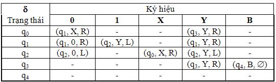 Q = {q0, q1, q2, q3, q4}; ∑= {0, 1}; Γ = {0, 1, X, Y, B} và F = {q4}.