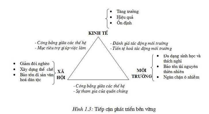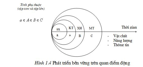 Từ khái niệm phát triển bền vững, thực chất là một sự phát triển có tinh tổng hợp cao và có hệ thống. Tiếp cận quan điểm hệ thống và tổng hợp cho phép hai nhà môi trường học Canađa là Jacobs và Sadler trình bày mối quan hệ biện chứng giữa phát triển và môi trường trong sơ đồ dưới đây (H.1.2)