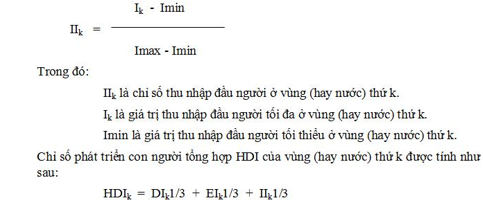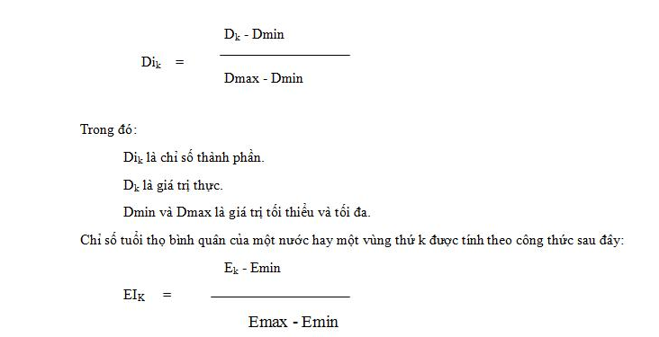 Trong đó, a và b là hai hệ số dương, người ta đã xác định được a = 2/3 và b = 1/3. Đối với các chỉ tiêu thành phần, chỉ số phát triển giáo dục DIk của vùng (hay nước) thứ k được tính theo công thức: