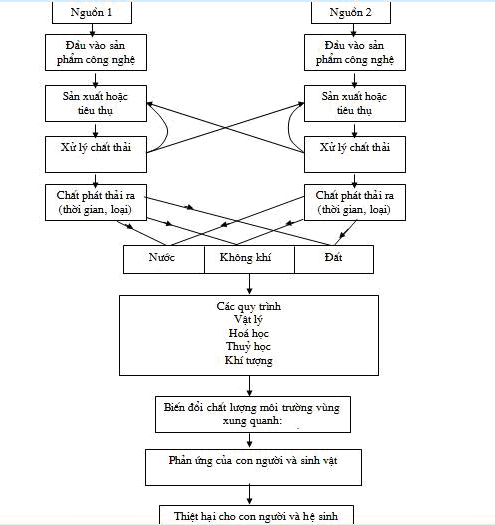Từ sơ đồ trên ta thấy mặc dù các dòng vật chất phát thải ra từ hai nguồn khác nhau, nhưng khi đã phát thải vào thành phần môi trường chúng hợp lại với nhau thành một nguồn phát thải hỗn hợp . Ví dụ: Chất phát thải ra nguồn nước từ hai nhà máy giấy cùng phân bố dọc bờ của một con sông thì hỗn hợp chất thải trong nước sông không thể phân định là của nhà máy nào. Hay là, khi có một triệu chiếc mô tô chạy trong một thành phố, thì chất thải phát ra của chúng kết hợp lại thành một hỗn hợp đồng nhất. Tuy nhiên, cũng có những trường hợp chúng ta có thể phân định được. Ví dụ, nếu có một nhà máy nhiệt điện phân bố trong thành phố và nhà máy khác lại phân bố cách thành phố vài ba chục cây số ở đầu gió, thì rõ ràng là nhà máy điện ở gần hơn phải chịu trách nhiệm lớn hơn trong việc gây ô nhiễm không khí trong thành phố.