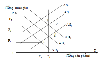 Tuy nhiên tỷ lệ thất nghiệp thực tế thấp hơn tỷ lệ thất nghiệp tự nhiên nên tiền lương tăng và đường tổng cung sẽ di chuyển đến AS2 ,đưa nền kinh tế từ điểm 1’ sang 2’ .Nền kinh tế quay trở về mức sản lượng tiềm năng và tỷ lệ thất nghiệp tự nhiên nhưng ở một mức giá cả P2 > P1 .Lúc này tỷ lệ thất nghiệp lại cao hơn mục tiêu ban đầu .Do đó các nhà hoạch định chính sách lại tìm cách làm tăng tổng cầu .Quá trình này cứ tiếp diễn và đẩy giá cả trong nền kinh tế lên cao hơn .
