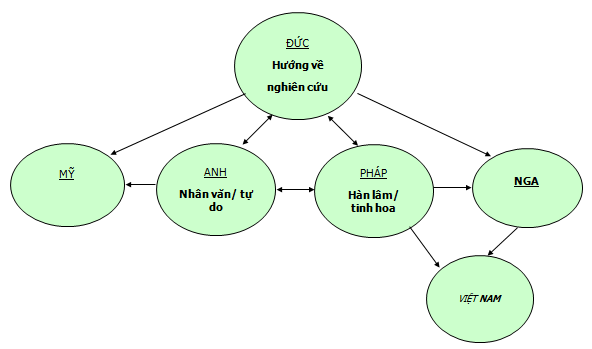 Trong GDĐH, “Văn Miếu” - Hà Nội, được thành lập vào những thập niên cuối của thế kỷ thứ 11, thường vẫn được xem là trường ĐH đầu tiên ở Việt Nam. Tuy nhiên, có thể cho rằng, nền GDĐH Việt Nam chỉ được thực sự hình thành vào cuối những năm 50 của thế kỷ trước, khi có một loạt các trường ĐH lớn được thành lập vào thời kỳ 1956-1960 trên cả hai miền Nam-Bắc. Và do bối cảnh lịch sử, nền GDĐH lúc bấy giờ chịu khá nhiều ảnh hưởng của nền GDĐH Nga, một phần nào đó của nền GDĐH Pháp và của cả nền GD Nho giáo (Hình 1), nặng về tính hàn lâm, tinh hoa, khoa bảng và hướng về nghiên cứu (research-oriented).