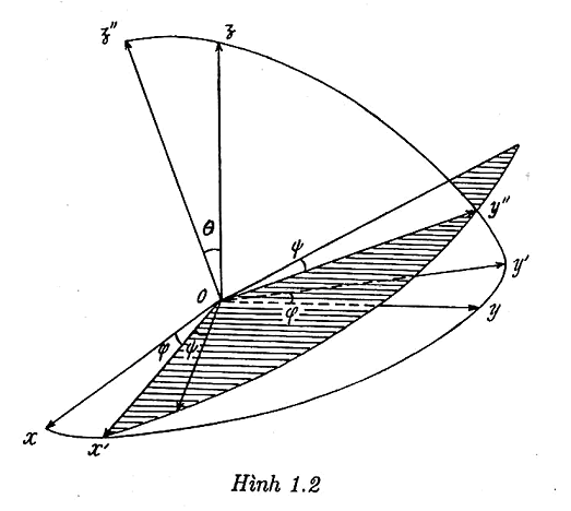 Xét nhóm quay trong không gian ba chiều SO(3). Mọi phép quay không gian ba chiều quanh gốc tọa độ O đều có thể được thực hiện dưới dạng tổ hợp của ba phép quay liên tiếp sau đây: phép quay góc φ quanh trục Oz chuyển các trục tọa độ Ox và Oy thành Ox’ và Oy’, phép quay góc quanh trục mới Ox’ chuyển các trục mới Oy’ và Ox thành Oy’’ và Oz’’, phép quay góc quanh trục mới Oz’’ (xem hình 1.2). Ba thông số φ, , gọi là ba góc Euler. Ký hiệu phép quay với ba góc Euler.