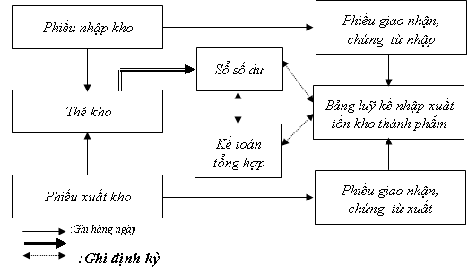 Ở kho: Việc ghi chép tình hình nhập xuất tồn kho do thủ kho tiến hành trên thẻ kho và chi ghi theo chỉ tiêu số lượng. Khi nhận chứng từ nhập, xuất thành phẩm thủ kho phải kiểm tra tính hợp lý, hợp pháp của chứng từ rồi tiến hành ghi số thực nhập, thực xuất trên chứng từ vào thẻ kho. Định kỳ, thủ kho gửi phòng kế toán hoặc kế toán xuống kho nhận các chứng từ nhập, xuất đã được phân loại theo từng loại thành phẩm.
