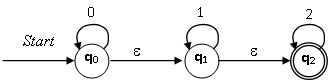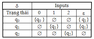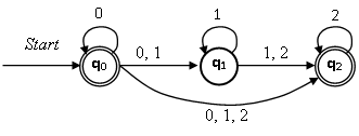 Theo khái niệm hình thức, ta có NFA M ({q0, q1, q2}, {0, 1, 2}, δ, q0, {q2}) với hàm chuyển δ như sau :