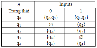 NFA M ({q0, q1, q2, q3, q4}, {0, 1}, d, q0, {q2, q4}) với hàm chuyển d như sau :