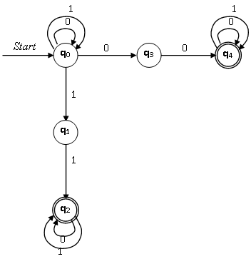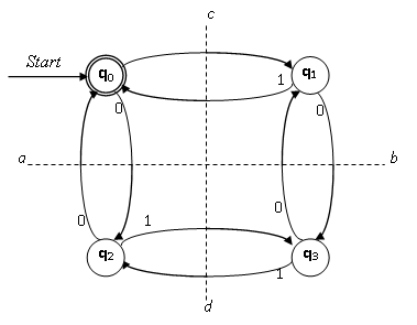 Chẳng hạn, sơ đồ chuyển của một DFA được mô tả trong hình 3.1. Trạng thái khởi đầu q0 được chỉ bằng mũi tên có nhãn "Start". Chỉ có duy nhất một trạng thái kết thúc, cũng là q0 trong trường hợp này, được chỉ ra bằng hai vòng tròn. Ôtômát này chấp nhận tất cả các chuỗi số 0 và số 1 với số số 0 và số số 1 là số chẵn.