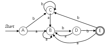 Từ các tập trạng thái này, ta xác định được A là trạng thái bắt đầu, E là trạng thái kết thúc (vì trong E có chứa trạng thái 10 là trạng thái kết thúc của NFA) và bảng hàm chuyển của DFA như sau :