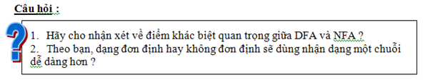 Nhận xét : Mặc dù có sự khác nhau trong định nghĩa, ta thấy dạng không đơn định NFA được định nghĩa tổng quát hơn dạng đơn định DFA, nhưng rõ ràng khả năng nhận dạng cùng lớp ngôn ngữ của chúng là tương đương nhau. Trong thực tế, các máy tính số hoàn toàn là đơn định, trạng thái của chúng tại mỗi thời điểm là xác định được duy nhất từ một chuỗi nhập bất kỳ và trạng thái bắt đầu.
