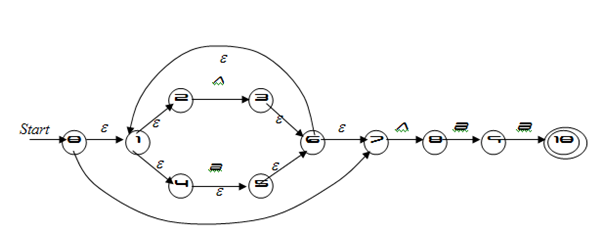 - ε-closure(δ(A, a)) = ε-closure({3, 8}) = {1, 2, 3, 4, 6, 7, 8} = B*