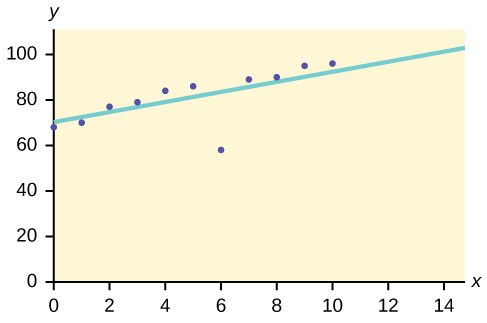 The outlier appears to be at (6, 58). The expected y value on the line for the point (6, 58) is approximately 82. Fifty-eight is 24 units from 82. Twenty-four is more than two standard deviations (2s = (2)(8.6) = 17.2 ). So 82 is more than two standard deviations from 58, which makes (6, 58) a potential outlier.