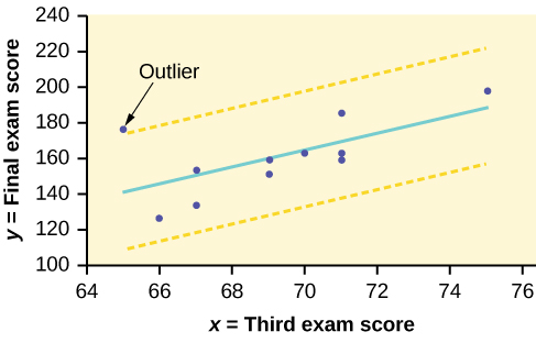 In the third exam/final exam example, you can determine if there is an outlier or not. If there is an outlier, as an exercise, delete it and fit the remaining data to a new line. For this example, the new line ought to fit the remaining data better. This means the SSE should be smaller and the correlation coefficient ought to be closer to 1 or –1.
