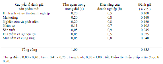 Có thể sử dụng phương pháp chỉ số có trọng số để đánh giá từng ý tưởng sản phẩm. Ở cột thứ nhất là các yếu tố cần đánh giá về khả năng thành công của một sản phẩm mới trên thị trường. Cột thứ hai thể hiện hệ số chỉ tầm quan trọng của mỗi yếu tố đánh giá. Trong cột thứ ba biểu thị khả năng của doanh nghiệp. Điểm đánh giá tổng hợp các yếu tố (tổng cộng các tích số của cột thứ hai và cột thứ ba) cho chúng ta một tiêu chuẩn để đánh giá khả năng thành công của một ý tưởng sản phẩm. Trong ví dụ trên ý tưởng về sản phẩm mới đạt 0,635 điểm, tức là được xếp vào loại có khả năng thành công trung bình.