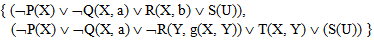 (¬P(X) ˅ ¬Q(X, a) ˅ (R(X, b) ^ (¬R(Y, g(X, Y)) ˅ T(X, Y))) ˅ (S(U))