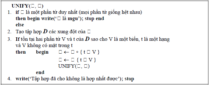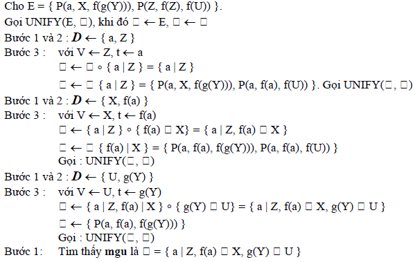 Sau đây ta xây dựng thuật toán đệ quy UNIFY(E, ) với là phép thế rỗng. Thuật toán tạo ra một mgu cho một tập hợp hữu hạn E các biểu thức hợp nhất được. Nếu E không là hợp nhất được, thuật toán dừng và thông báo.