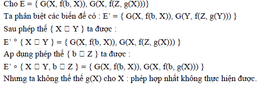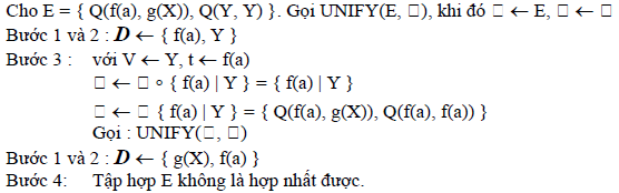 - Ở bước 3 trong thuật toán hợp nhất UNIFY( , ), đòi hỏi V phải không xuất hiện trong t : phép thế t cho V sẽ trở nên phức tạp không xác định được, không có kết quả, các biểu thức vẫn luôn phải hợp nhất.