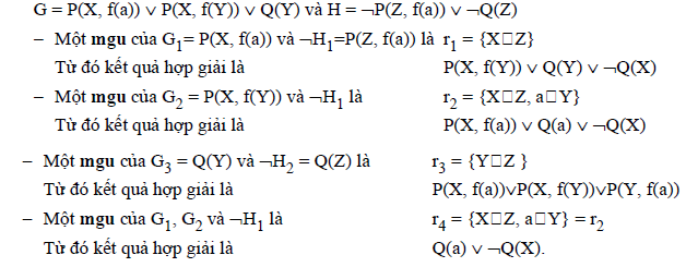 không có kết quả hợp giải. Nếu viết lại mệnh đề thứ hai thành ¬G(f(Y), Y) thì xuất hiện một mpu { f(X) X, a Y}, từ đó có thể suy ra tồn tại một kết quả hợp giải là mệnh đề rỗng.
