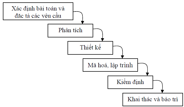 (i) Mô hình thác nước (Waterfall). Đây là chu trình phát triển đầu tiên, được Royce đề xuất năm 1970 để mô tả sự phát triển hệ thống tin học. Quá trình phần mềm được chia thành dãy các giai đoạn (các pha) liên tiếp từ phân tích yêu cầu, phân tích các thành phần, thiết kế, lập trình đến thử nghiệm và triển khai hệ thống. Giai đoạn sau chỉ được bắt đầu khi giai đoạn trước đã hoàn thành (không được chờm lên nhau). Vì vậy chu trình phát triển này còn được gọi là chu trình tuyến tính (Hình 1).
