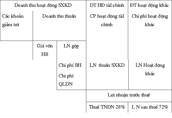 | Lợi nhuận trước thuế thu nhập doanh nghiệp | = | Lợi nhuận từ hoạt động sản xuất kinh doanh | + | Lợi nhuận hoạt động tài chính | + | Lợi nhuận hoạt động khác |
