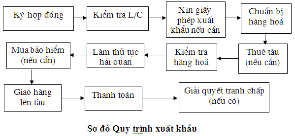 Để thực hiện hợp đồng xuất khẩu thì doanh nghiệp phải thực hiện các công việc khác nhau. Tuỳ theo điều khoản hợp đồng mà doanh nghiệp phải làm một số công việc nào đó. Thông thường các doanh nghiệp cần thực hiện các công việc được mô tả theo sơ đồ.