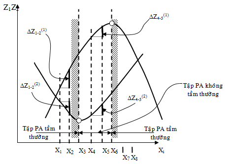 Nhưng, ví dụ với cặp PA: X4 và X5, khi chuyển từ X5 sang X4, với mục tiêu Z(2) ta giảm được ΔZ4-5 (2) (mong muốn) nhưng mục tiêu Z(1) lại bị giảm một đại lượng ΔZ4-5(1) (không mong muốn). Như vậy, ở đây các mục tiêu “mâu thuẫn nhau”. Chúng là tập các PA không tầm thường – NPAKTT (còn gọi là tập các PA không bị trội – non-dominated).