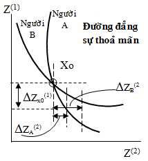 Do thiên hướng khác nhau, ở mức giải pháp XO, để bù cho việc giảm bớt mục tiêu Z(1) là ΔZXo(1), người A có thể đánh đổi tương đương với việc tăng lên tương ứng là ΔZA (2) trong khi người B lại chỉ có thể đánh đổi tương đương lớn hơn với việc tăng lên tương ứng là ΔZB (2) của mục tiêu Z(2). ĐĐTM thường có dạng Hyperbol vì với gia số 1kg thịt, “giá trị” rau cần đánh đổi tương đương ở mức 1-2 kg thịt / tháng là khác với giá trị ở mức 10 -12 kg thịt / tháng đối với một gia đình. Các ĐĐTM cũng lập thành từng nhóm biểu thị những “mức thỏa mãn” khác nhau (H.4). Nhóm đường (A) là của người (A) và nhóm đường (B) là của người (B).