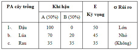 Ví dụ: Một người nông dân có ba PA cây trồng: I (đậu), II (lúa), III (rau). Giả sử tình hình khí hậu của mùa đến có thể là A tốt và B xấu với xác suất xảy ra bằng nhau, đều là 50%. Khả năng thu nhập ròng (tính theo đơn vị triệu Đ chẳng hạn) của các PA cho ở bảng sau:
