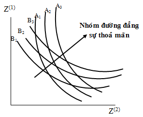 - Đường đẳng sự thoả mãn. Việc lựa chọn PA nào trong số NPAKTT nói trên lại tùy thuộc vào thái độ, hoàn cảnh và thiên hướng ưa thích (preference) của từng người, tạm gọi là “thiên hướng riêng”. Thiên hướng riêng, để dễ hình dung, có thể biểu thị qua nhóm các “đường cong không khác nhau” (Hình 3) – còn gọi là đường “đẳng sự thỏa mãn” (ĐĐTM).