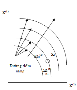 - Đường cong tiềm năng.Lại giả sử chúng ta có “vấn đề” với hai mục tiêu là MaxZ(1) và MaxZ(2). Khi đó có thể biểu thị mối quan hệ Z(1), Z(2) trong phạm vi NPAKTT như trên Hình 2. Chúng ta tạm gọi đó là “đường tiềm năng”. Với những tiềm lực khác nhau, chúng ta có các đường tiềm năng khác nhau.