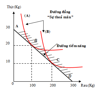 Ví dụ: Một gia đình chi tiêu cho nhu cầu thịt và rau: 1.500.000 Đ/ tháng. Thịt giá 50.000 Đ/kg và rau giá 5.000 Đ/kg. Vậy gia đình đó có NPAKTT (theo giá chợ) là, ví dụ: 20 kg thịt –100 kg rau hoặc 10 kg thịt và 200 kg rau… Gia đình đó muốn tăng rau thì phải bớt thịt. Gia đình đó không thể mua nhiều thịt – rau hơn vì bị ràng buộc bởi “tiềm năng” 1.500.000 Đ và nếu chỉ mua được ít hơn thì đã bị mua đắt – “Tầm thường”. Nghĩa là gia đình này chỉ có NPAKTT là A, B, C, D… như trên hình 5. Đương nhiên, nếu khả năng chi phí cho thịt và rau có thể tăng lên 1,8 hay 2,0 triệu Đ / tháng chẳng hạn thì đường tiềm năng thịt - rau sẽ dịch về phía bên phải tương tự như trên Hình 2.