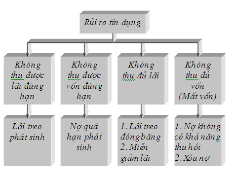 Rủi ro tín dụng tồn tại dưới nhiều hình thức ,các hình thức đó luôn chuyển biến cho nhau,mà mức độ cuói cùng là nợ không có khả năng thu hồi. Khi nghiên cứu về rủi ro tín dụng người ta thường chú trọng vào các nguy cơ xảy ra rủi ro như lãi treo và đặc biệt là nợ phát sinh ,còn lãi treo đóng băng và nợ quá hạn không có khả năng thu hồi được coi là các tình huống rủi ro thực sự nên thường được xem xét để giải quyết hậu quả và rút ra bài học.