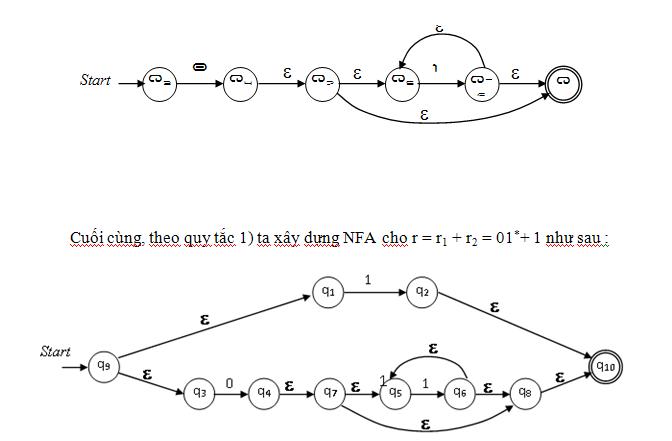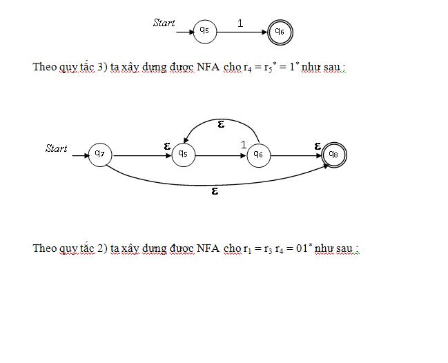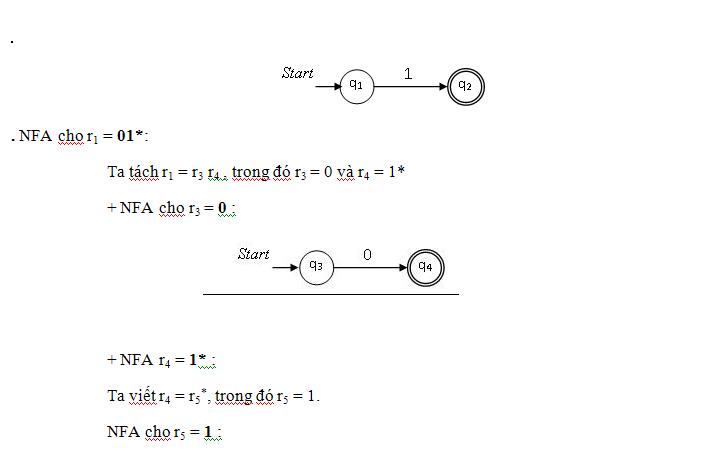 Ta sẽ lần lượt xây dựng các NFA cho các biểu thức chính quy con, sau đó dựa vào các quy tắc kết hợp để xây dựng NFA cho toàn bộ biểu thức chính quy đã cho.