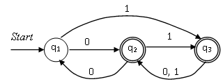 Gọi DFA được chỉ ra trong hình 3.10 là M ({q1, q2, q3}, {0, 1}, δ, q1, {q2, q3}). Ta thấy, tập hợp tất cả các chuỗi được chấp nhận bởi DFA trên là các chuỗi làm cho ôtômát chuyển từ trạng thái bắt đầu q1 đến một trong hai trạng thái kết thúc q2 và q3 và không chuyển qua số tối đa là 3 (k = 3) trạng thái của ôtômát. Vậy ta cần viết biểu thức chính quy ký hiệu cho tập hợp này như sau :
