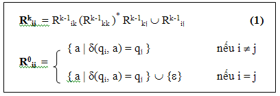 . Công thức (1) cho R k ij chỉ liên quan đến các phép toán trên biểu thức chính quy: hợp, nối kết, và bao đóng. Hơn nữa theo giả thiết quy nạp, với mỗi l, k và m tồn tại biểu thức chính quy r k-1 lm sao cho L( r k-1 lm ) = R k-1 lm . Vậy đối với r k ij ta có thể chọn biểu thức chính quy :