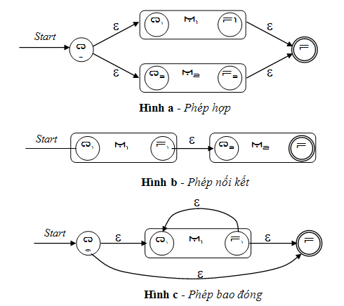 Cách xây dựng M được chỉ ra trong hình c. Mỗi đường đi từ q 0 tới f 0 gồm: hoặc đường đi từ q 0 tới f 0 bằng nhãn ε ; hoặc đường đi từ q 0 tới q 1 bằng nhãn ε và sau đó là đường đi từ q 1 tới f 1 trên chuỗi thuộc L(M), rồi đến f 0 bằng nhãn ε . Như vậy có đường đi từ q 0 tới f 0 nhãn là x nếu và chỉ nếu ta có thể viết x = x 1 x 2 ... x j với j ≥ 0 (trường hợp j = 0 khi x = ε ) ∀ x i ∈ L(M 1 ). Vậy L(M) = L(M 1 ) * .