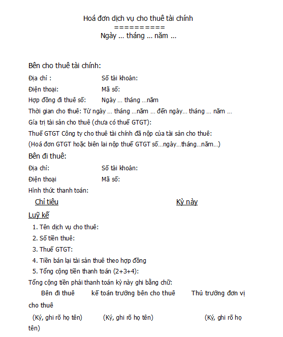 - Khi lập hoá đơn dịch vụ cho thuê tài chính, bên cho thuê phải thực hiện đầy đủ các yếu tố quy định trên hoá đơn. Riêng cột thuế GTGT (kỳ này) được xác định theo nguyên tăc phân bổ đều số thuế GTGT đã nộp của tài sản cho thuê tương ứng với thời gian thuê.