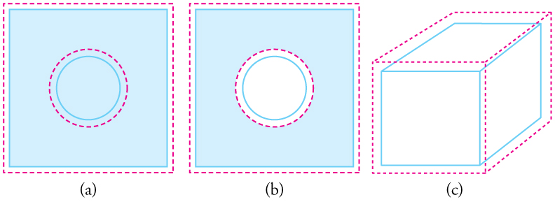 Objects expand in all dimensions, as illustrated in [link]. That is, their areas and volumes, as well as their lengths, increase with temperature. Holes also get larger with temperature. If you cut a hole in a metal plate, the remaining material will expand exactly as it would if the plug was still in place. The plug would get bigger, and so the hole must get bigger too. (Think of the ring of neighboring atoms or molecules on the wall of the hole as pushing each other farther apart as temperature increases. Obviously, the ring of neighbors must get slightly larger, so the hole gets slightly larger).