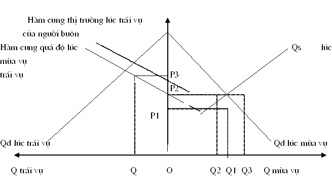 Xem xét giá P1. Nếu giá P1 phổ biến suốt thời kỳ mùa vụ thì lượng cung sẽ cân bằng với lượng cầu trên thị trường, sẽ không có lúa gạo để mua dự trữ. Đường cung quá độ sẽ khởi điểm tại toạ độ 0, P1. Muốn có dự trữ, thương nhân phải trả giá cao hơn P1 (giá lúc mùa vụ), giả dụ giá P2. Khi đó, lượng cầu lúc mùa vụ giảm đi và lượng cung cho thị trường tăng thêm. Lượng cung quá độ này được thương nhân đưa vào dự trữ. Như vậy lượng cung quá độ để cung cấp cho thị trường lúc trái vụ chính là hàm số của giá lúa gạo lưu hành lúc mùa vụ. Trên hình vẽ, đường nét liền biểu diễn hàm số này trước khi gánh chịu mức chi phí kinh doanh của thương nhân do phải trả giá P2 cao hơn mức giá P1 của thị trường lúc mùa vụ; còn đường nét đứt biểu diễn hàm số đó sau khi có khoản chi phí này. Quan hệ giá cả - số lượng biểu thị lượng cung thị trường theo giá lúc trái vụ nên đường nét đứt phản ảnh giá lúa gạo tương đương phải có trong lúc trái vụ để bù đắp chi phí kinh doanh và có lợi nhuận của thương nhân.