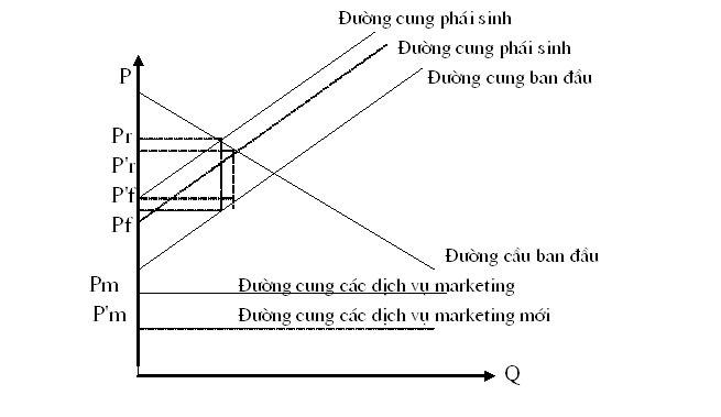 Do chi phí lớn về dịch vụ markrting trên dây chuyền theo giá Pm, đường cong cung phái sinh với giá lẻ được hình thành bằng cách cộng thêm đoạn thẳng đứng Pm và đường cong cung ban đầu ở cấp nông trại. Giao điểm đường cong cung phái sinh với đường cong cầu ban đầu ở cấp bán lẻ cho giá cân bằng thị trường Pr. Nghĩa là khi giá cân bằng, giá ở nông trại sẽ là Pf = Pr - Pm. Nếu hoàn thiện phương tiện vận chuyển và đường giao thông làm cho chi phí trên dây chuyền thị trường giảm xuống còn P'm, đường cong cung phái sinh dịch chuyển xuống và có thể cắt đường cong cầu ban đầu và tạo ra giá bán lẻ cân bằng P'r. Như vậy giá lẻ hạ đi và thị trường mở rộng ra với lượng cầu tăng lên từ a lên b. Khi đó giá ở nông trại cũng cần thiết tăng từ Pf lên P'f để thúc đẩy tăng sản lượng từ a lên b. Nói cách khác, lợi ích của việc giảm chi phí trên dây chuyền thị trường được phân chia cho người sản xuất và người tiêu dùng theo tỷ lệ tuỳ thuộc vào độ dốc của đường cong cung và cầu.