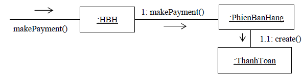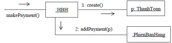 Hãy xét mối quan hệ giữa các lớp ThanhToan,HBHvà PhienBanHang trong hệ thống bán hàng. Giả sử cần phải tạo ra đối tượng :ThanhToan tương ứng với :PhienBanHang và :HBH nhận được yêu cầu thanh toán makePayment(). Bởi vì HBH phải “ ghi nhận” :ThanhToan nên theo mẫu tạo lập mới ở trên thì lớp HBHlà đại biểu để tạo lập. Điều này dẫn đến thiết kế biểu đồ cộng tác như hình 8.