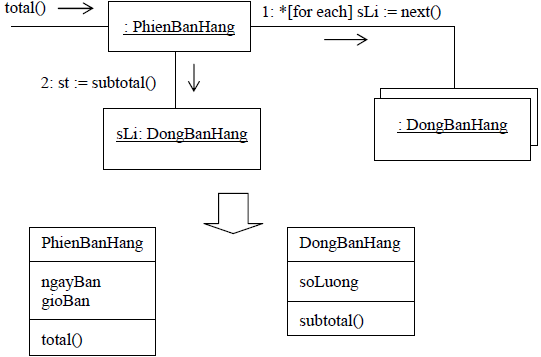 Sau khi gán total() cho lớp PhienBanHang thì lại phải biết thêm là ai cung cấp những mục con (số tiền bán từng mặt hàng). Thông tin này được xác định thông qua hàm subtotal(). Vì vậy, :PhienBanHang phải gửi tiếp thông điệp subtotal() cho từng : DongBanHang như hình 3.